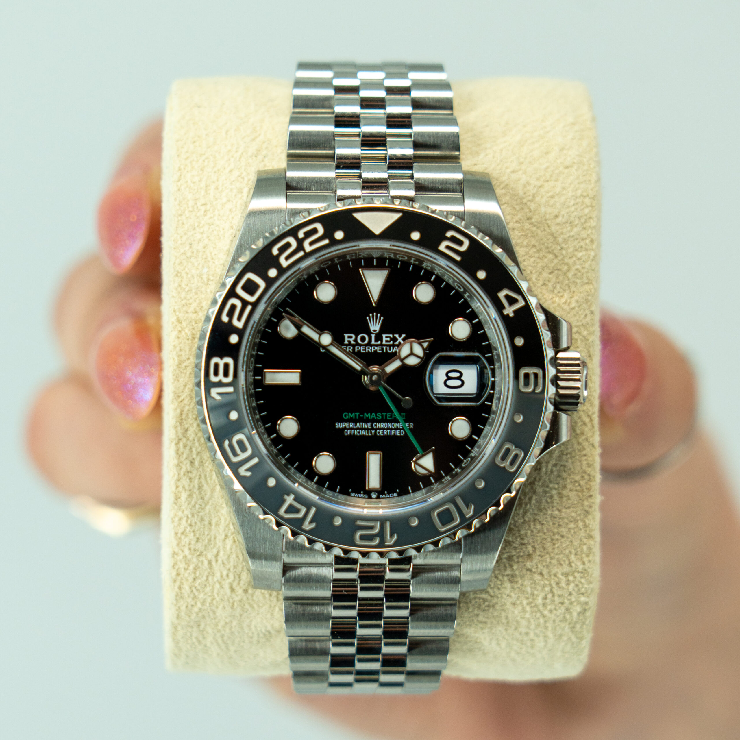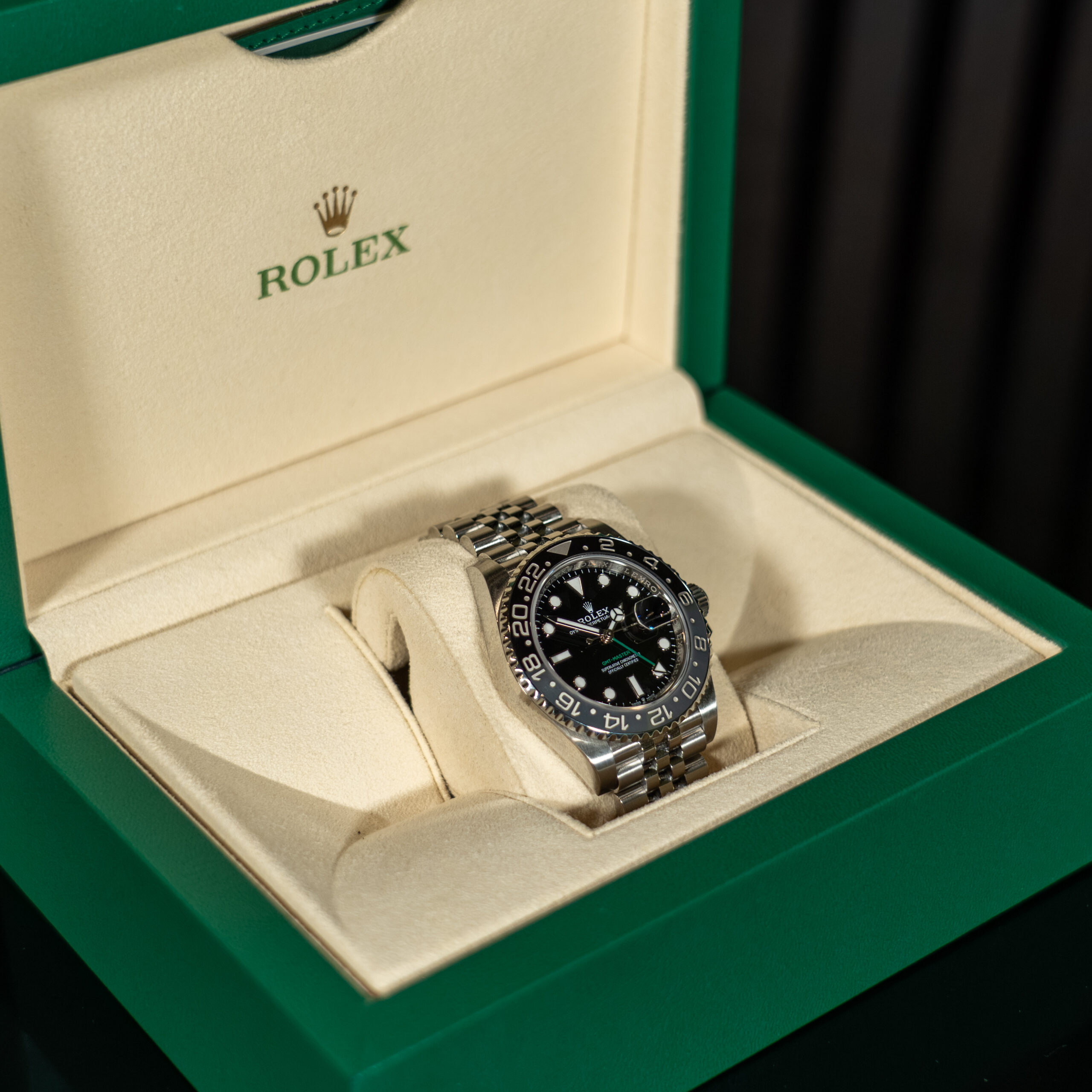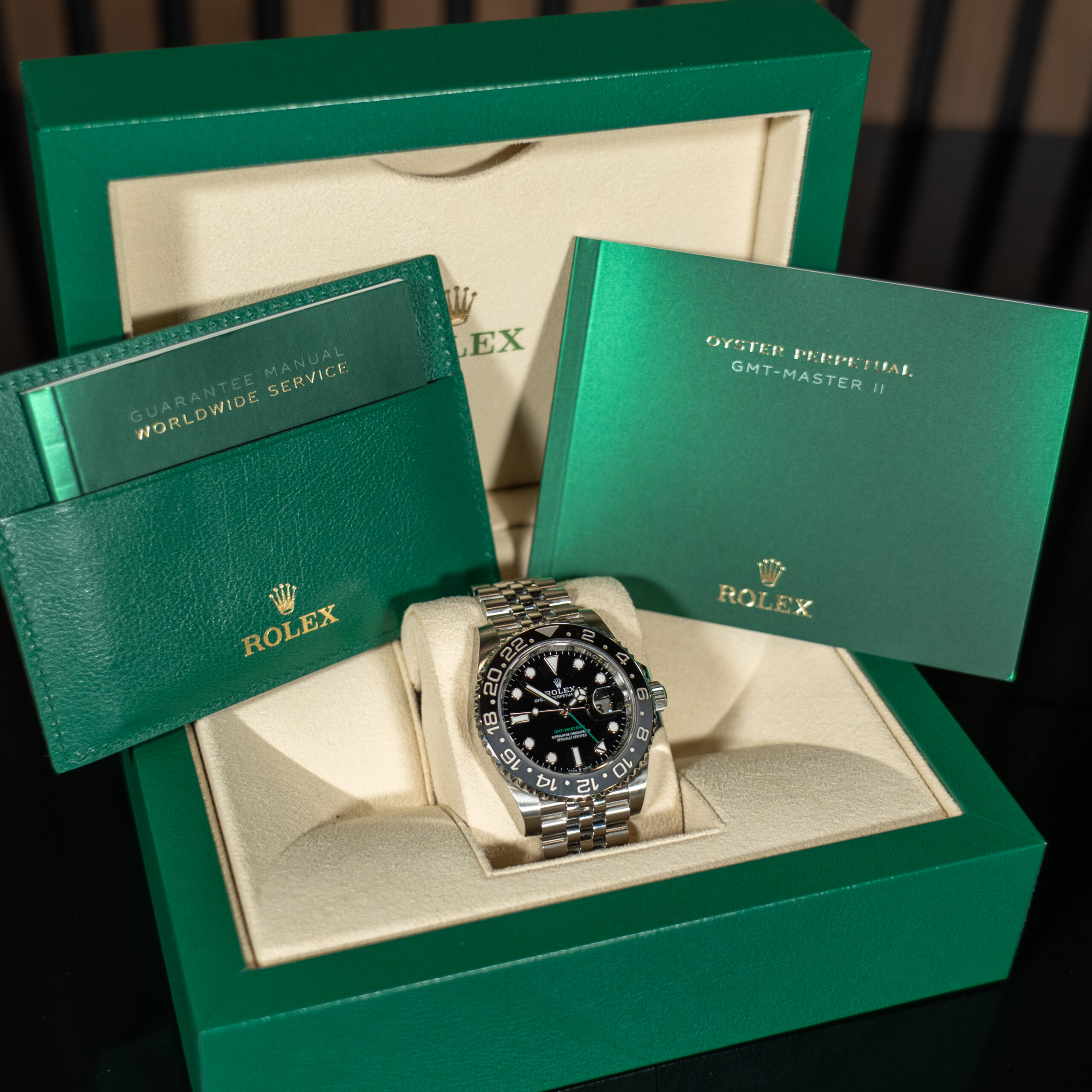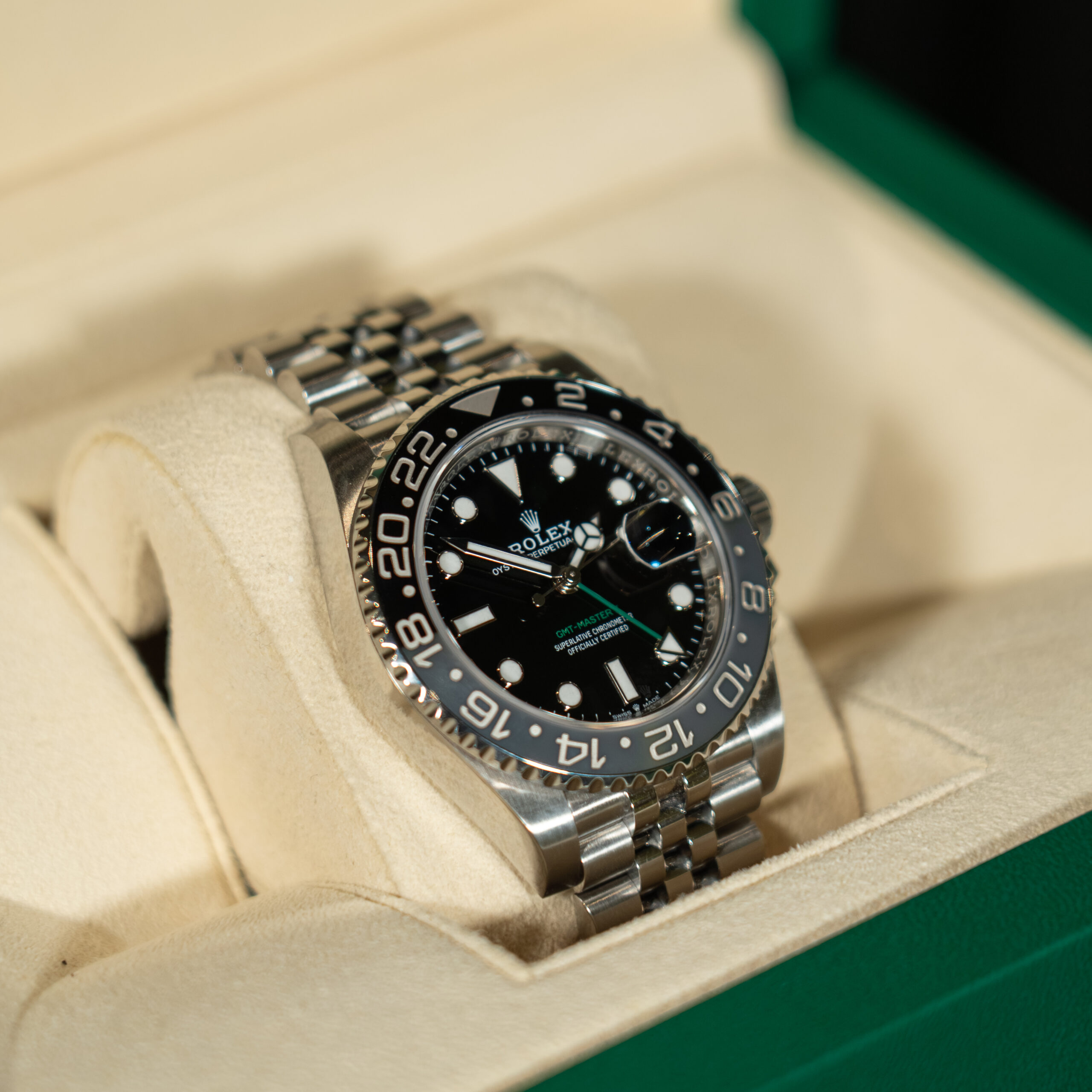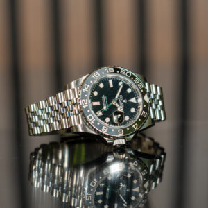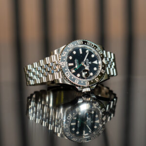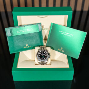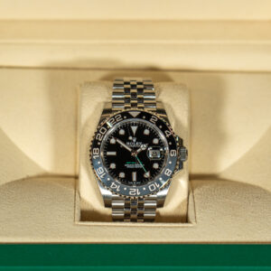 Crafted from Rolex’s signature Oystersteel, this watch features a black dial with a date aperture and a green GMT hand for that added pop of colour. Complementing the dial is a bi-directional rotating 24-hour bezel, with a grey and black ceramic insert and a scratch-resistant sapphire crystal.The watch is fitted with an Oyster bracelet and a folding Oysterlock clasp, which has the 5mm extension link. Powered by a self-winding automatic movement.