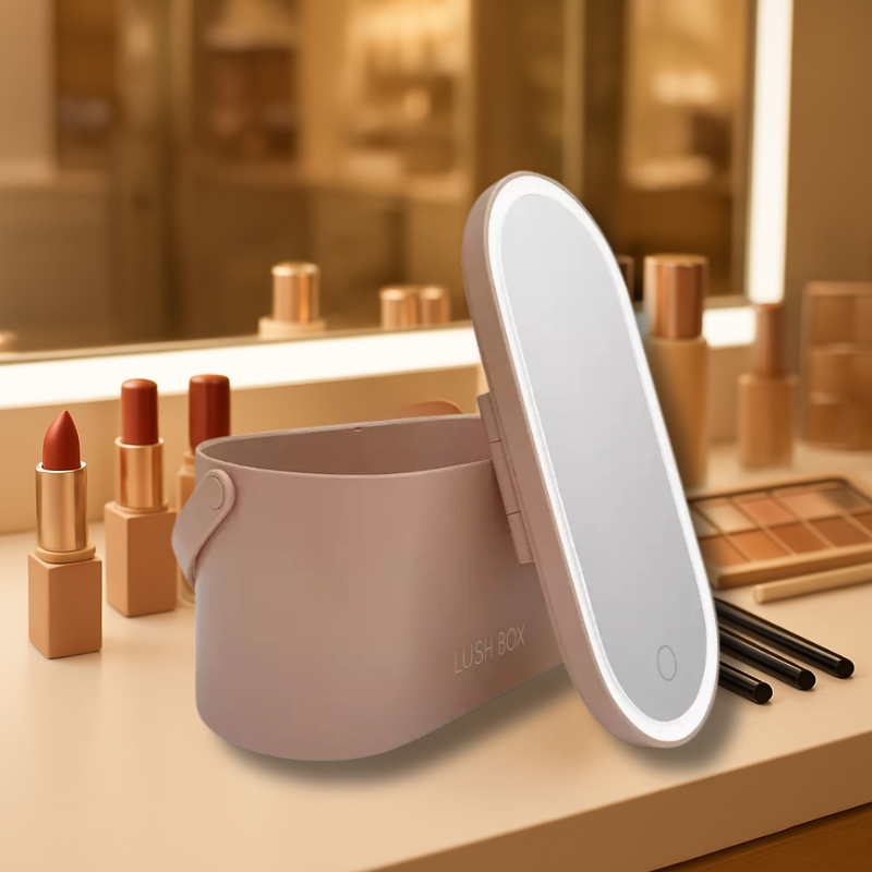 Have all your essential makeup tools and beauty products in one handy place with the stylish portable Lush Beauty Box. The lid doubles up as a pop-up or free-standing LED illuminated mirror for perfect makeup application, while the tough case construction and carry handle make it ideal for protecting your tools and cosmetics when travelling. Lightweight design and easy wipe clean waterproof finish. Fully portable – USB rechargeable.